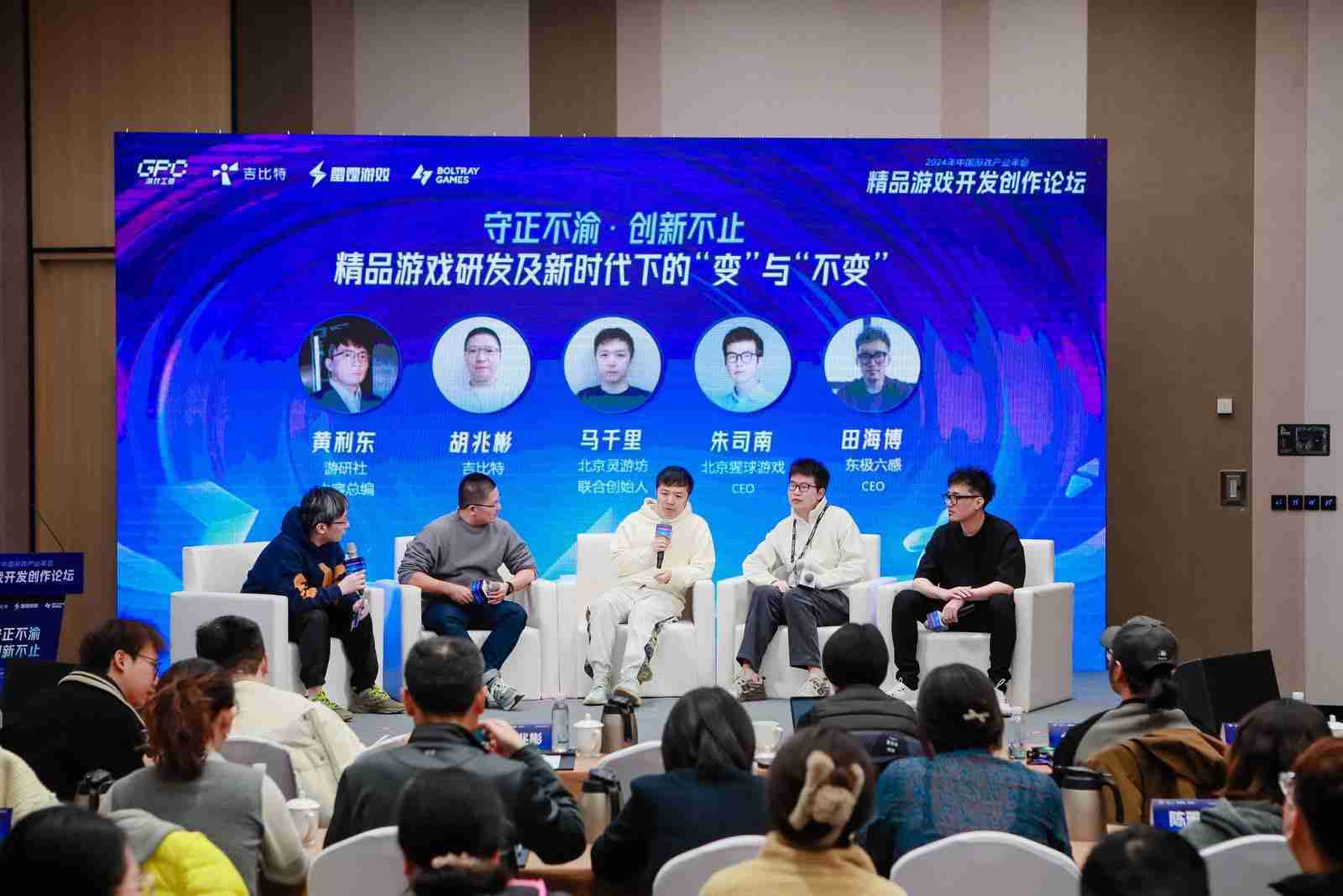 圆桌对话环节,,,在游研社内容总编黄利东的主持下,,,,一竞技CTO胡兆彬、、、、北京灵游坊联合创始人马千里、、、北京猩球游戏CEO朱司南、、、、东极六感CEO田海博等四位嘉宾围绕“守正不渝、、创新不止——精品游戏研发及新时代下的‘变’与‘不变’”这一主题分享了各自在精品游戏开发理念及工程能力搭建方面的见解和经历,,,并就行业变化下游戏人需要坚守的理念等展开交流探讨。。。