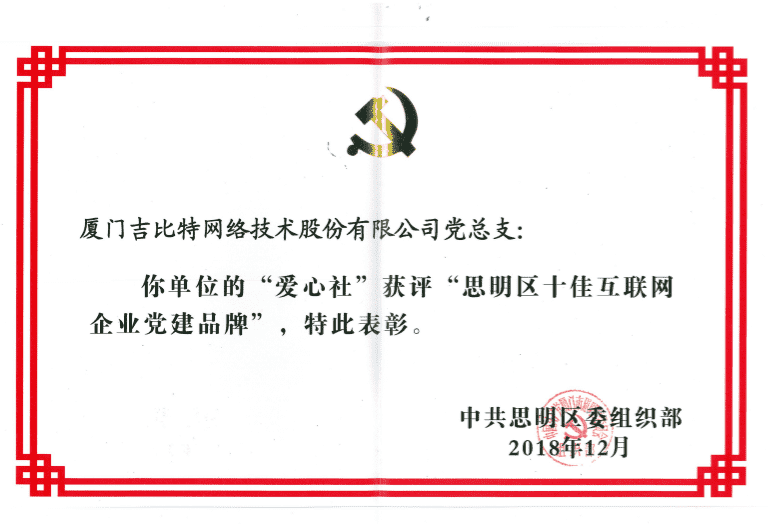 经初审评选、、网络评选和专家评审等环节,,"厦门一竞技网络技术股份有限公司党总支-爱心社" 从全区28个参评党建品牌中脱颖而出,,,获评"思明区十佳互联网企业党建品牌"。。。。
